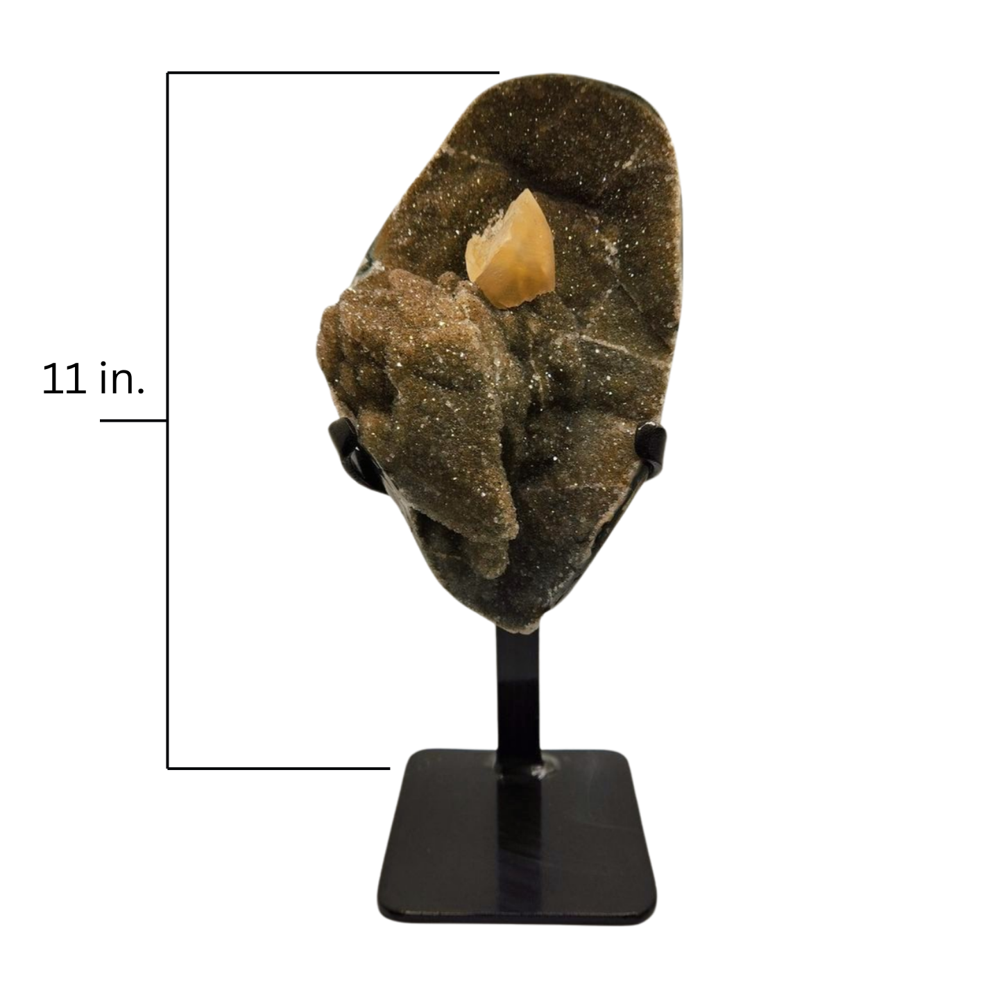 This is the kind of piece people notice the second they walk in the room. An 11-inch amethyst druzy matrix, completely covered in glittering micro-crystals, rises from a sleek black metal stand like a shard pulled from an ancient cavern. At its heart grows a natural golden calcite crystal, glowing warm against the deep amethyst sparkle — a perfect fusion of calm and clarity.
