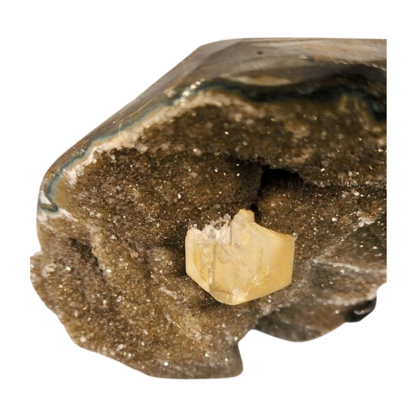 Under soft light, the druzy surface glitters like stars, while the calcite point stands out like a warm beacon. This is a true collector’s piece — sculptural, earthy, and absolutely one-of-a-kind.