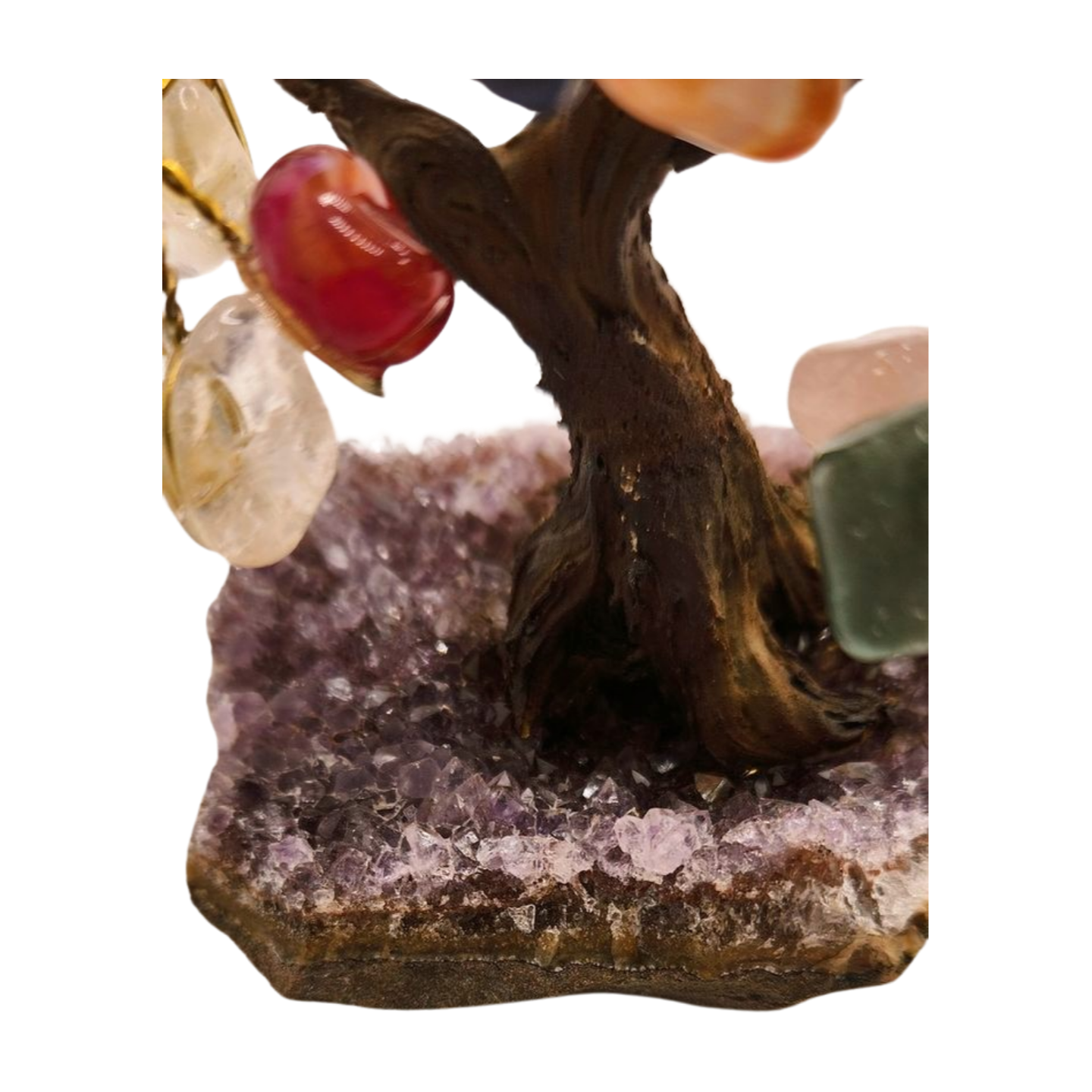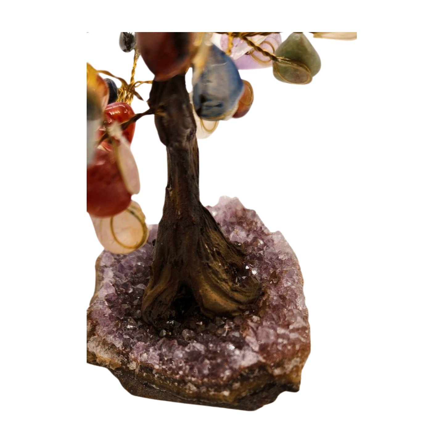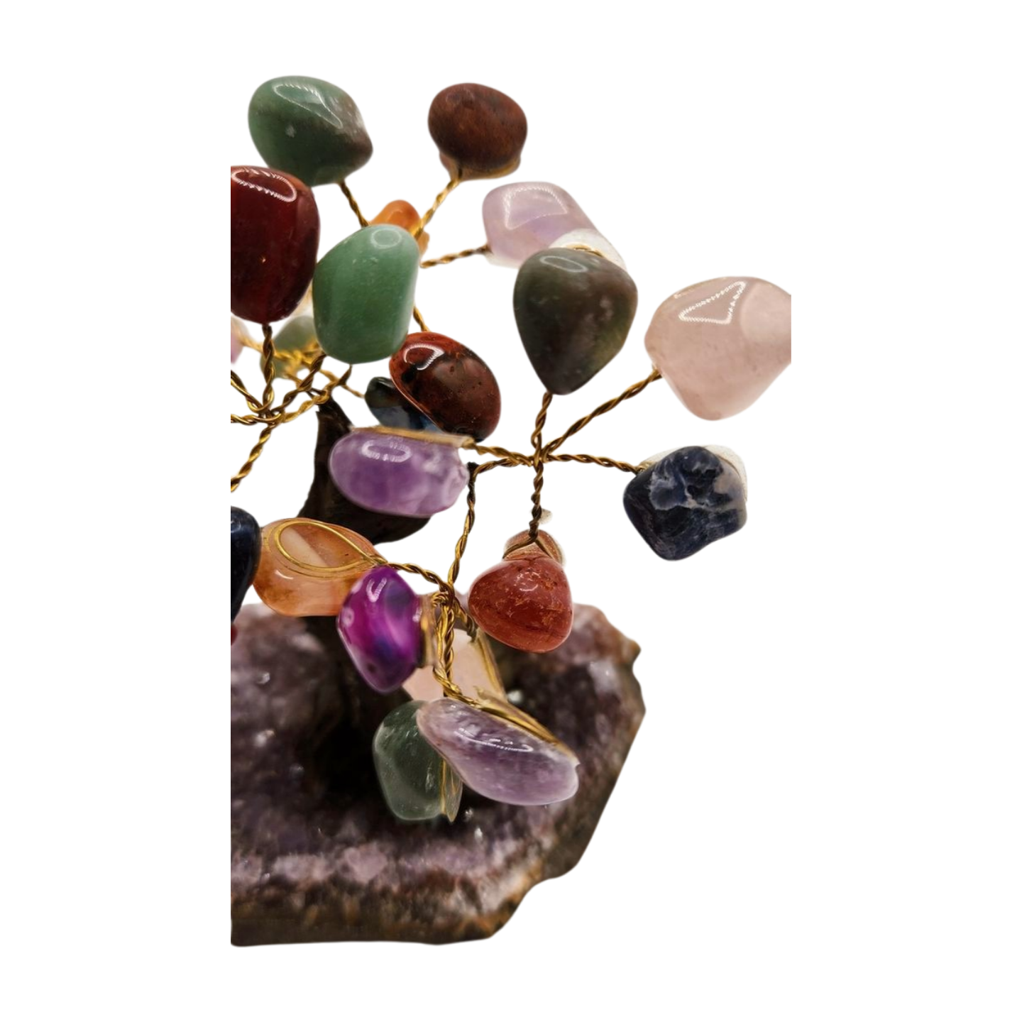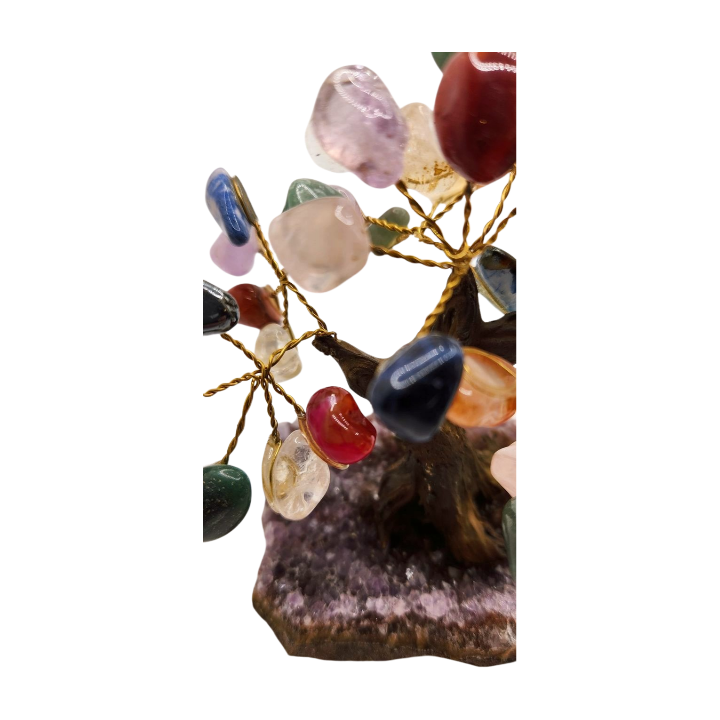 Each gemstone contributes its own meaning: clarity, love, protection, luck, grounding, creativity, intuition, and emotional balance. Combined, they form a powerful symbol of holistic well-being and radiant abundance. This tree is perfect for desks, shelves, meditation spaces, and anyone who loves the full spectrum of crystal energy.