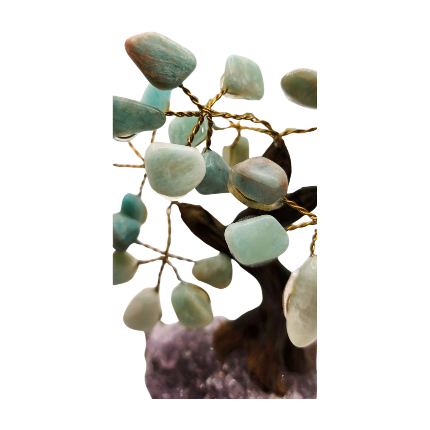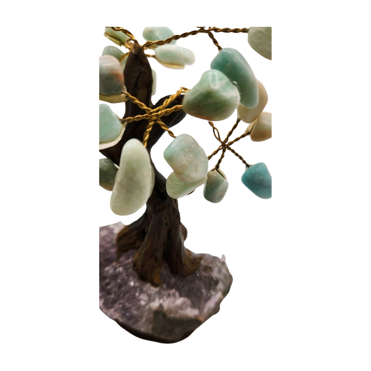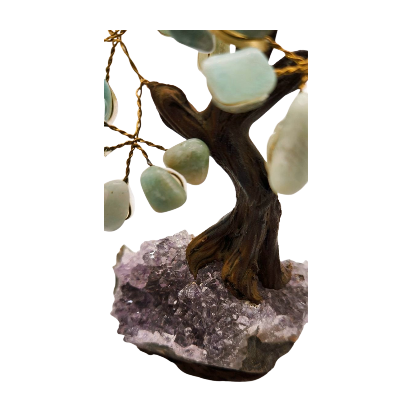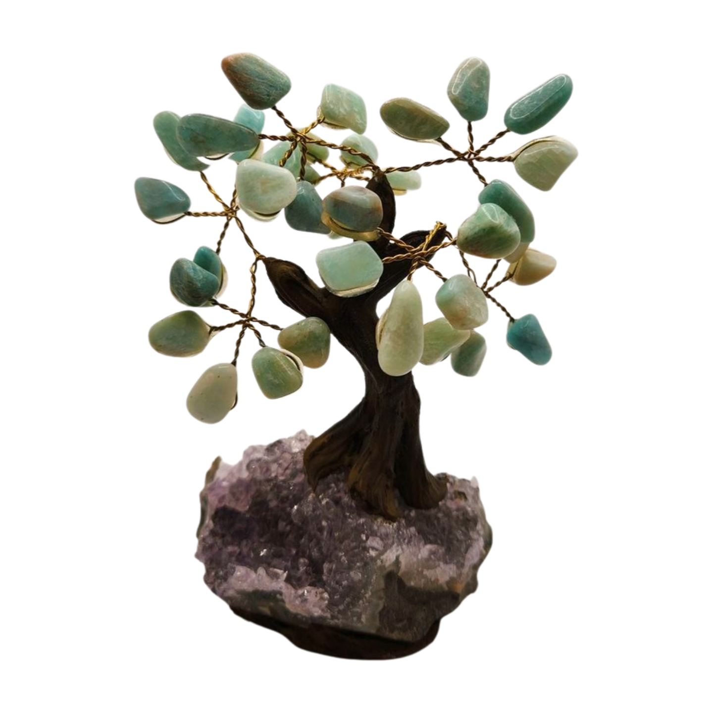 Amazonite is known as the Stone of Truth and Harmony, supporting clear communication, emotional balance, and peaceful confidence. Its gentle, refreshing energy makes this tree perfect for workspaces, bedrooms, meditation corners, and creative environments. Paired with the shimmering crystal base, it becomes a symbolic sculpture of aligned intention, tranquility, and balanced growth.