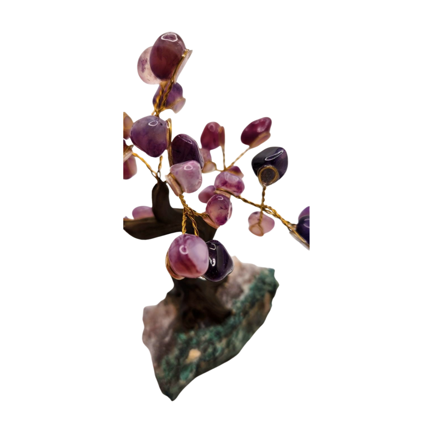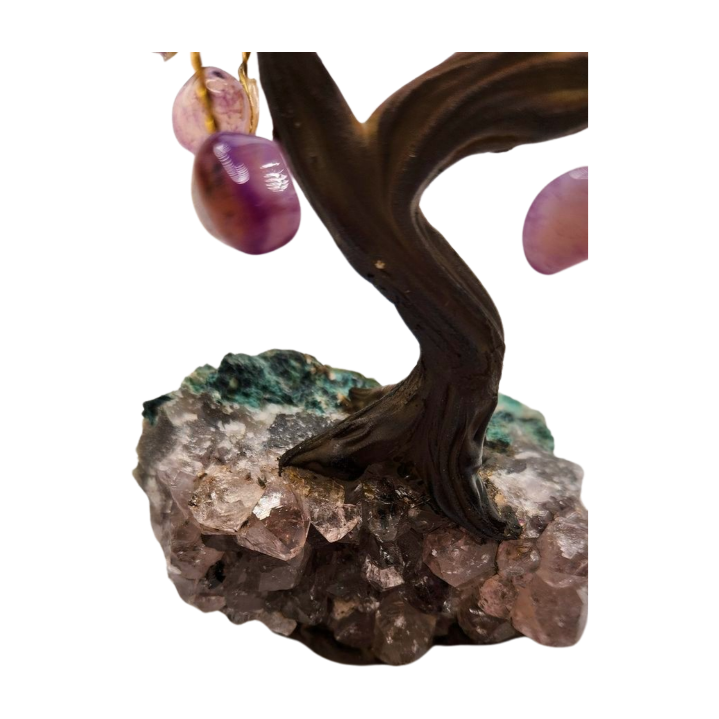 This handcrafted Purple Agate Bonsai Tree is a vibrant and artistic gemstone sculpture that brings color, creativity, and uplifting energy into any space. Each branch features polished purple agate stones in rich shades of lavender, plum, and deep violet, giving the tree a lively, expressive look. The flowing trunk design adds movement and elegance, while the tree stands on a sparkling crystal cluster base that enhances its beauty and energetic presence.