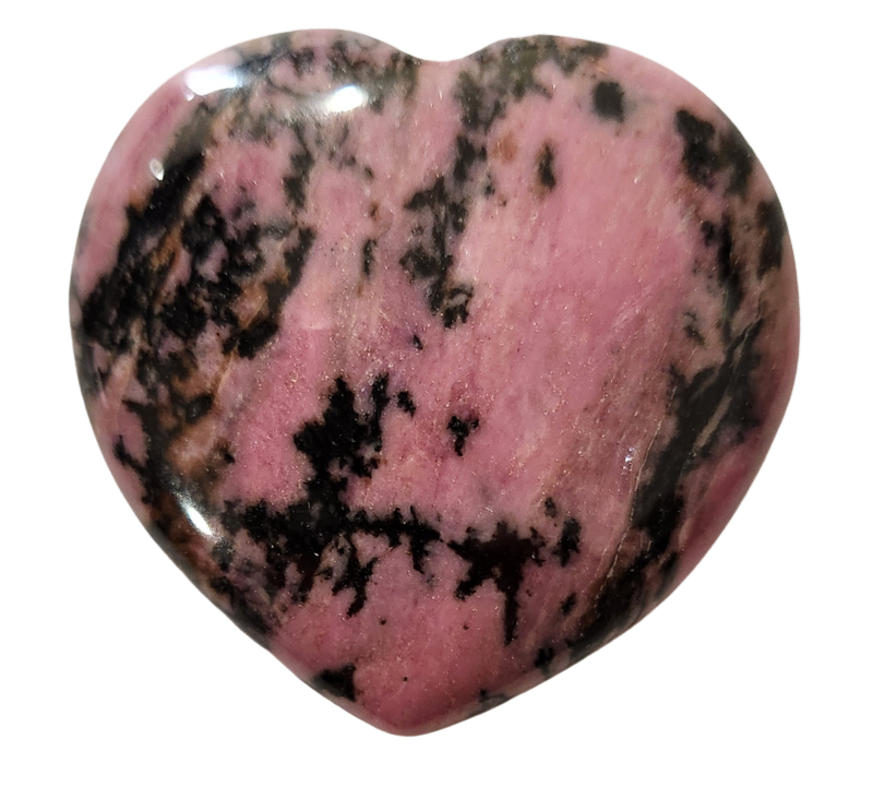 This rhodonite heart features soft pink tones accented by natural black veining, creating a striking contrast that makes each piece unique. Smooth and polished, it carries a balanced blend of warmth and depth, highlighting the stone’s natural beauty.