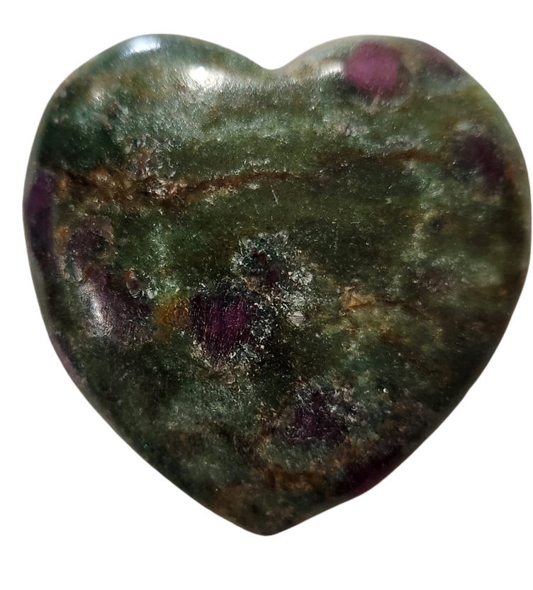 This ruby fuchsite heart features vibrant green tones accented by natural ruby inclusions, creating a striking blend of color and texture. Smooth and polished, each piece displays unique patterns where deep red and rich green come together in a bold, eye-catching design.
