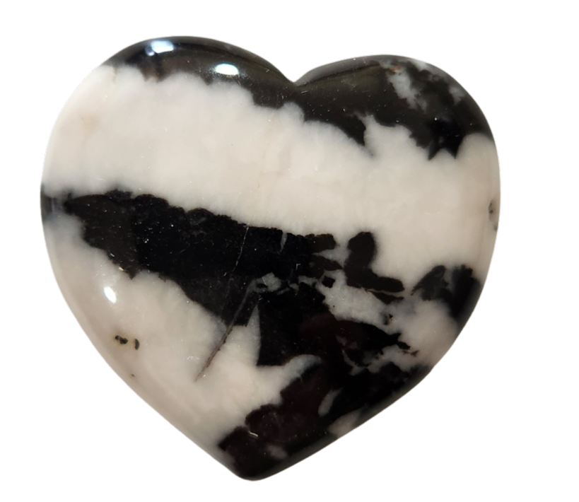This zebra jasper heart features bold black and white striping, creating a striking, high-contrast pattern that makes each piece unique. Smooth and polished, it carries a balanced and eye-catching appearance with natural variations in every heart.